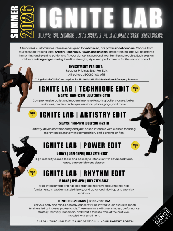 Designed for intermediate to advanced dancers, our brand-new Ignite Lab Intensives are a total game changer. With customizable scheduling and four unique training tracks, dancers can build their perfect two-week experience — leveling up artistry, technique, power, and rhythm like never before.